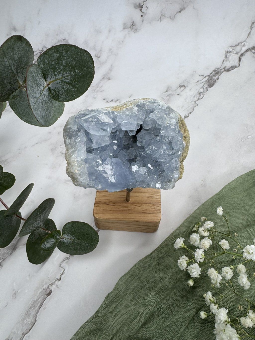 Položte drúzu celestýnu tam, kde chcete cítit klid. Na pracovní stůl, do ložnice, do meditačního koutku nebo do prostoru, kde často komunikujete. Jeho přítomnost jemně pročistí atmosféru a přinese pocit lehkosti.