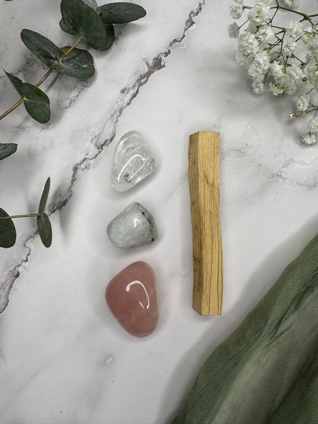 - V každé sadě krystalů je také Palo Santo dřevo a látkový pytlíček
