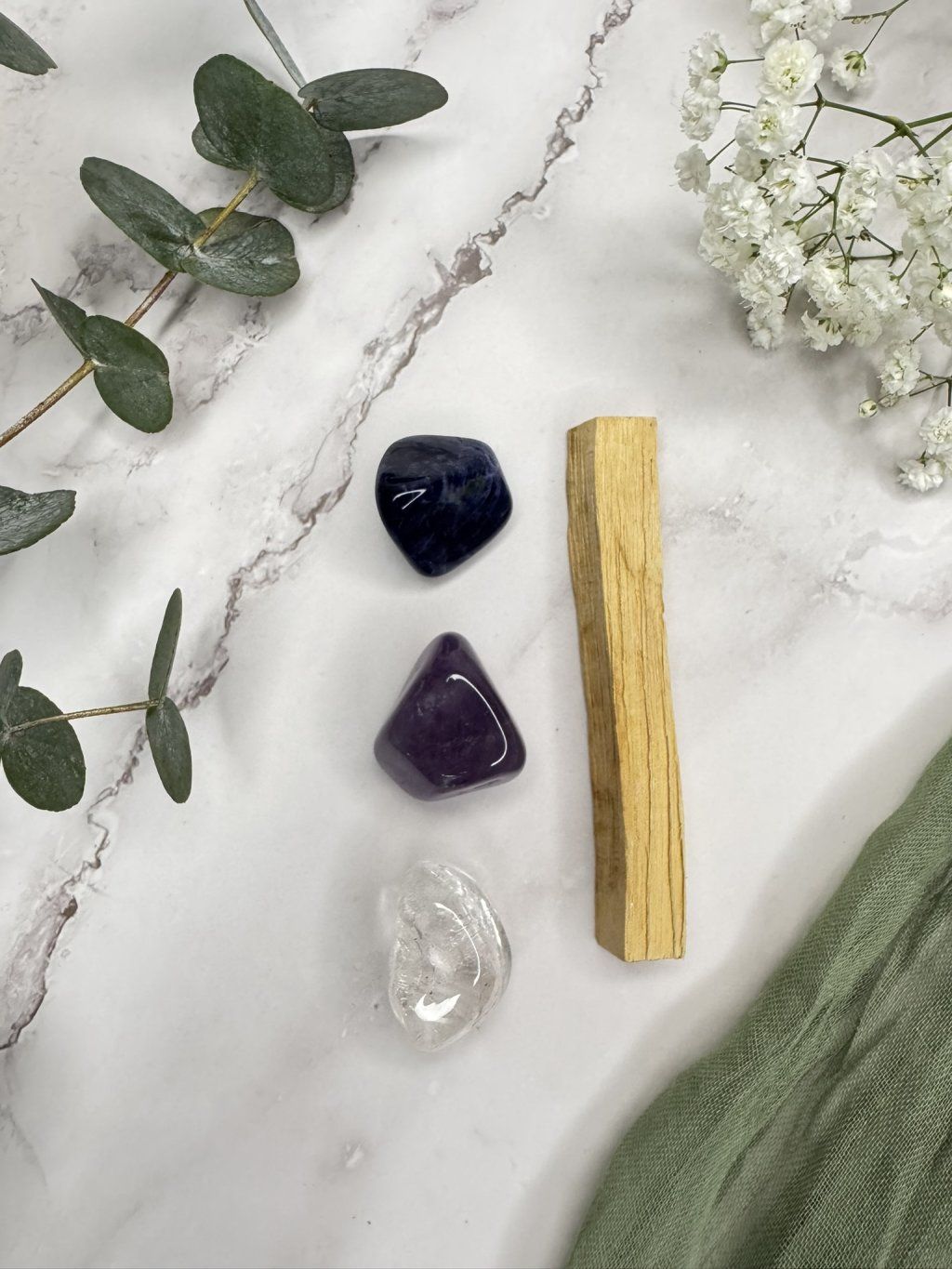 - V každé sadě krystalů je také Palo Santo dřevo a látkový pytlíček