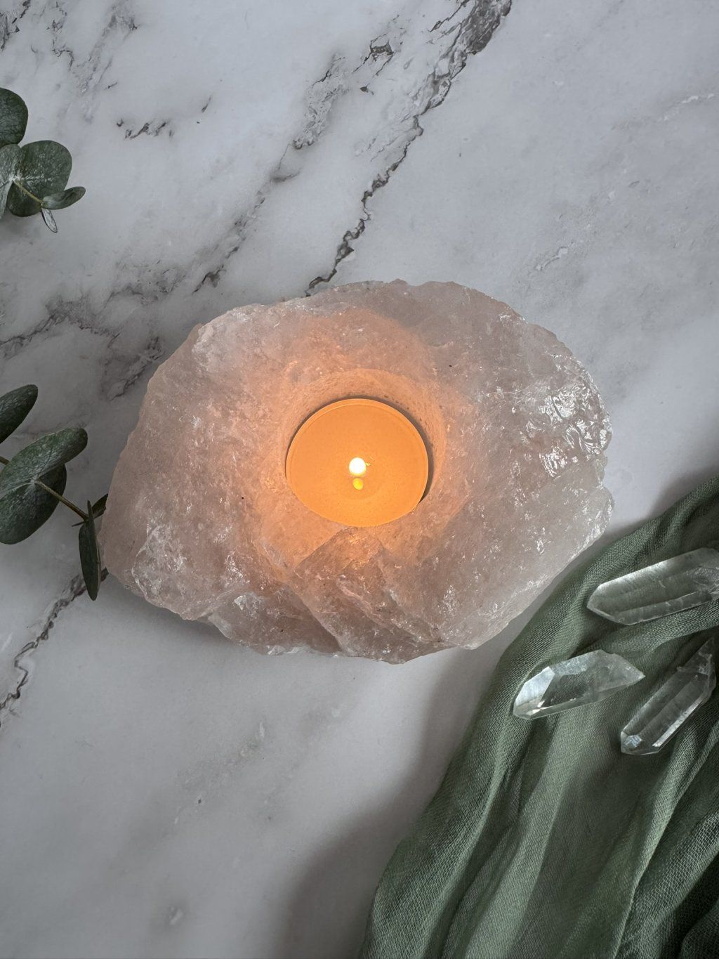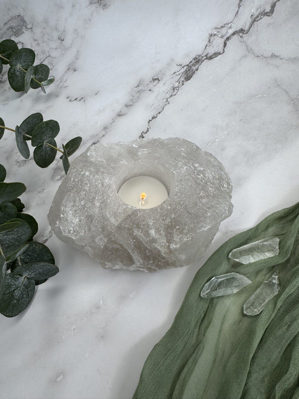 Krystalový svícen z křišťálu je vyrobený ze surového, neleštěného kamene, který si zachovává svou přirozenou kresbu, strukturu i jedinečnost. Na vrchní straně má vyvrtaný otvor pro čajovou svíčku a spodní plocha je doplněná o ochranné prvky, které pomáhají chránit povrch, na kterém křišťálový svícen stojí.