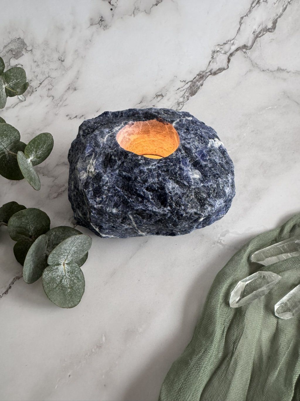 Každý kus je originál stejně jako jednotlivé krystaly, takže se může jemně lišit tvarem, odstínem i velikostí, protože příroda netvoří podle šablon. Spojení surové krásy kamene sodalitu a teplého plamene svíčky vytváří v interiéru klidnou, útulnou atmosféru a dělá ze svícnu nádherný doplněk každého prostoru.