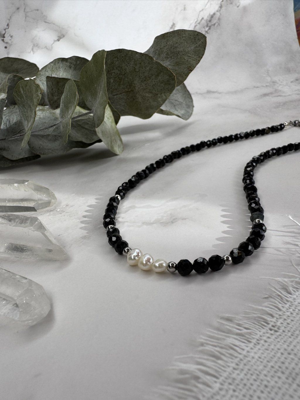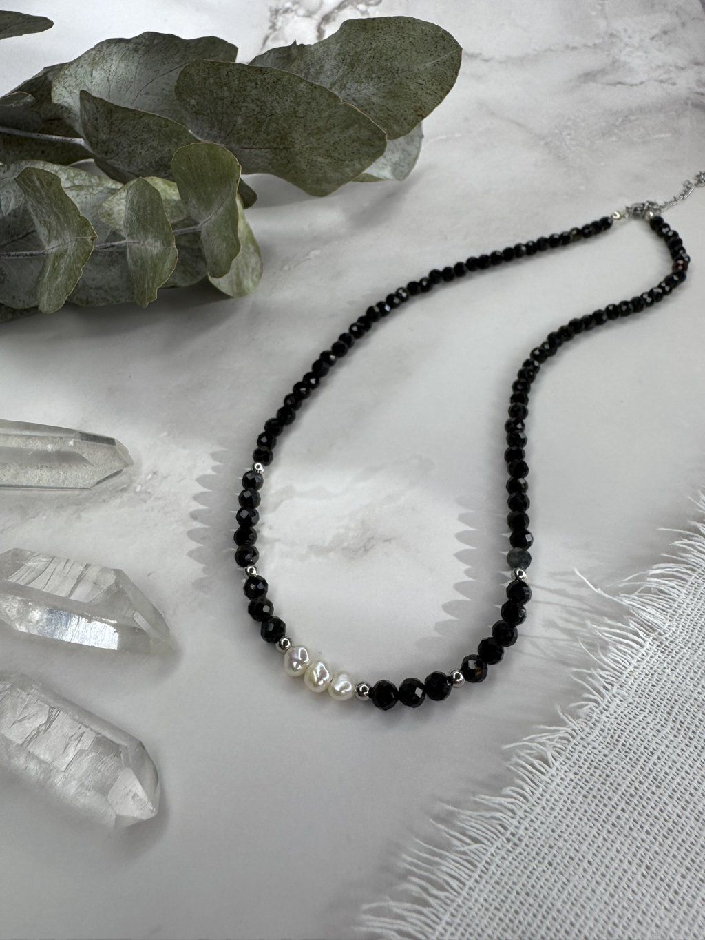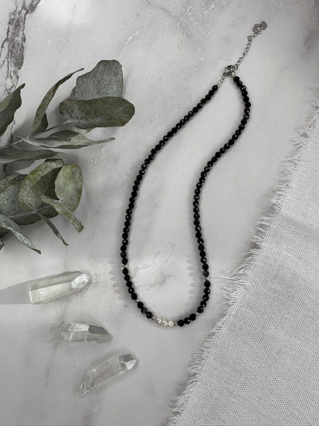 Pečlivě opracované korálky obsidiánu ladí s jemnou perlovou strukturou, která dodává šperku harmonický kontrast. Každý minerál i perla je jedinečná, a společně tvoří náhrdelník plný osobité energie. Řetízek má zapínání s prodloužením, abyste si mohli jeho délku pohodlně upravit.