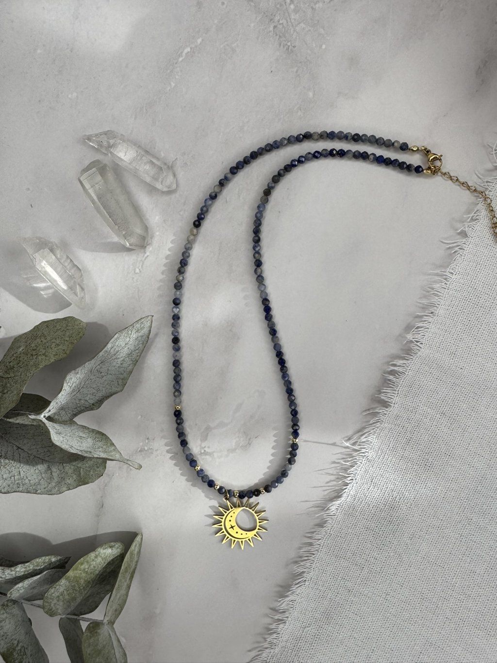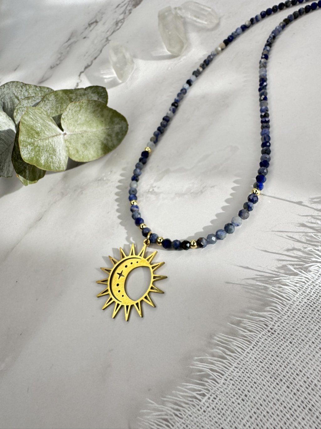 Náhrdelník z minerálů sodalit je jemný šperk, který může nést hlubší osobní význam. Vzniká jako tichý společník pro každý den – něco, co nosíte blízko srdce a připomíná vám to záměr, který můžete do náhrdelníku uložit.