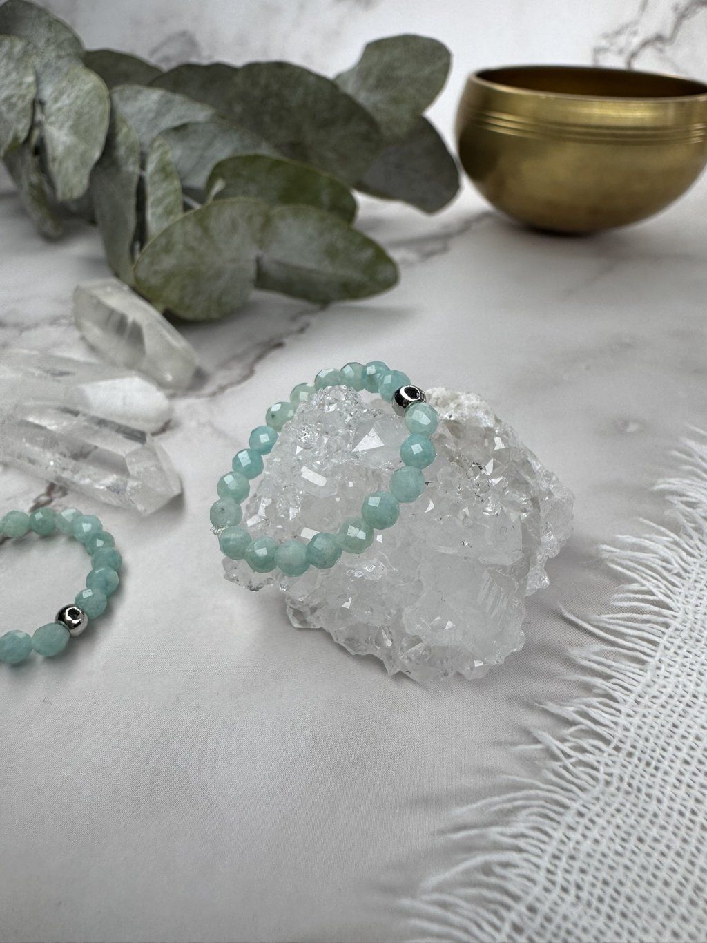 Naše prsteny z minerálů vznikají s důrazem na minimalismus a jemnost. Drobné kuličky o průměru 2 až 3,5 mm působí nenápadně, ale přesto zaujmou – hlavně díky tomu, že každý minerál má svůj vlastní charakter. Celý prsten z broušených amazonitů je navlečený na tenké, pružné gumičce, takže se pohodlně nosí a hezky se přizpůsobí prstu o obvodu cca 7 cm (velikost M) nebo 6,5 cm (velikost S).