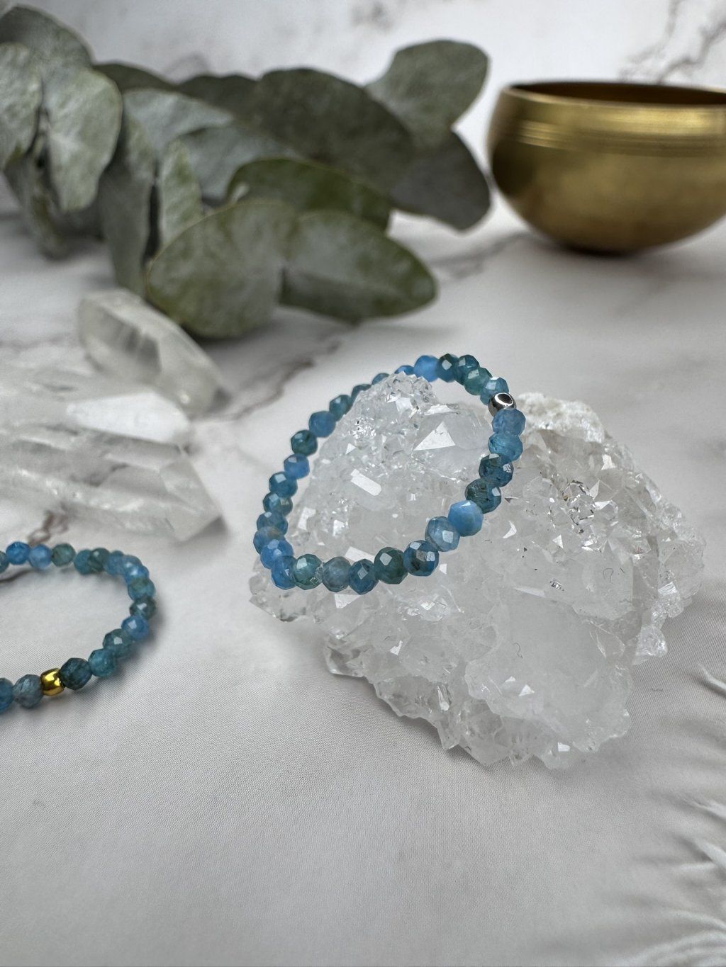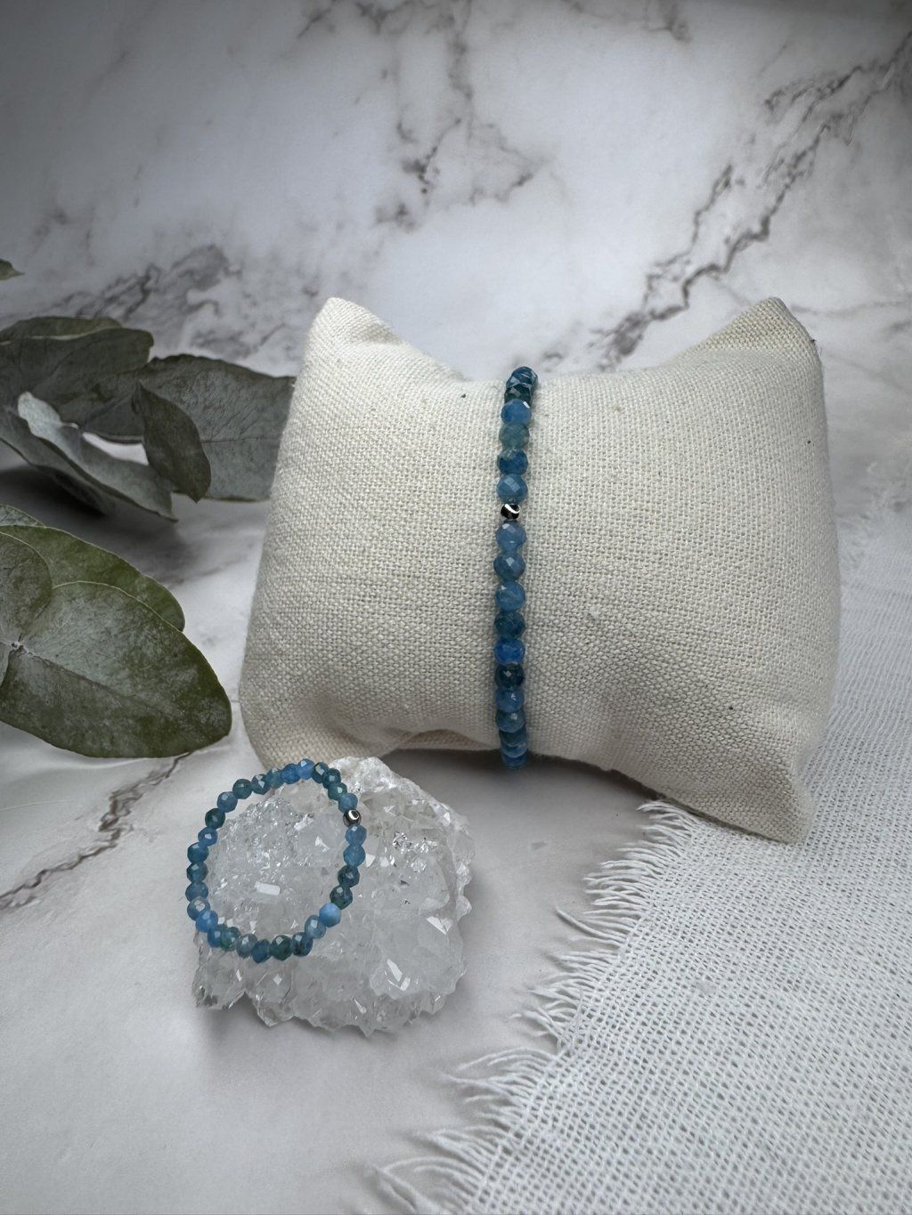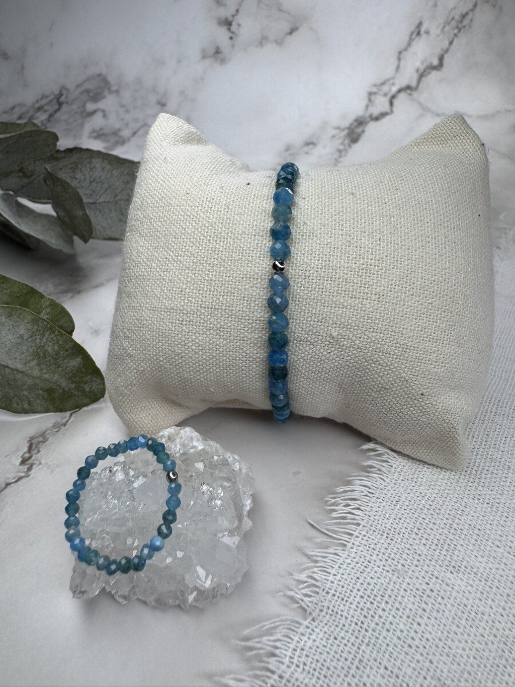 Sada náramku a prstenu z apatitu je víc než jen šperk. Je to jemná připomínka vaší vnitřní síly, hlasu a autenticity. Modré odstíny apatitu působí svěže a klidně zároveň – jako nádech čerstvého vzduchu, který vám pomůže zpomalit a znovu se naladit na sebe.