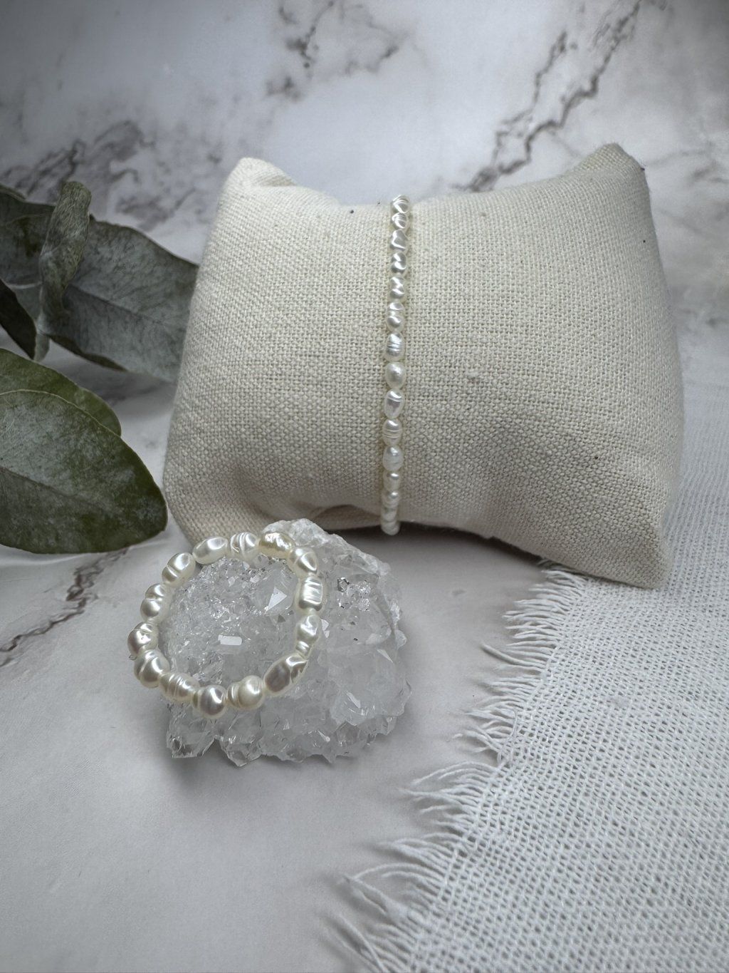 Říční perly působí čistě, sofistikovaně a velmi žensky. Každá z nich je originál, s jemnými odchylkami tvaru i lesku, což dodává šperkům autenticitu a jedinečnost. Prsten z minerálů je navržený tak, aby se pohodlně přizpůsobil prstu, náramek je navlečený na pružné gumičce, díky čemuž se příjemně nosí po celý den.